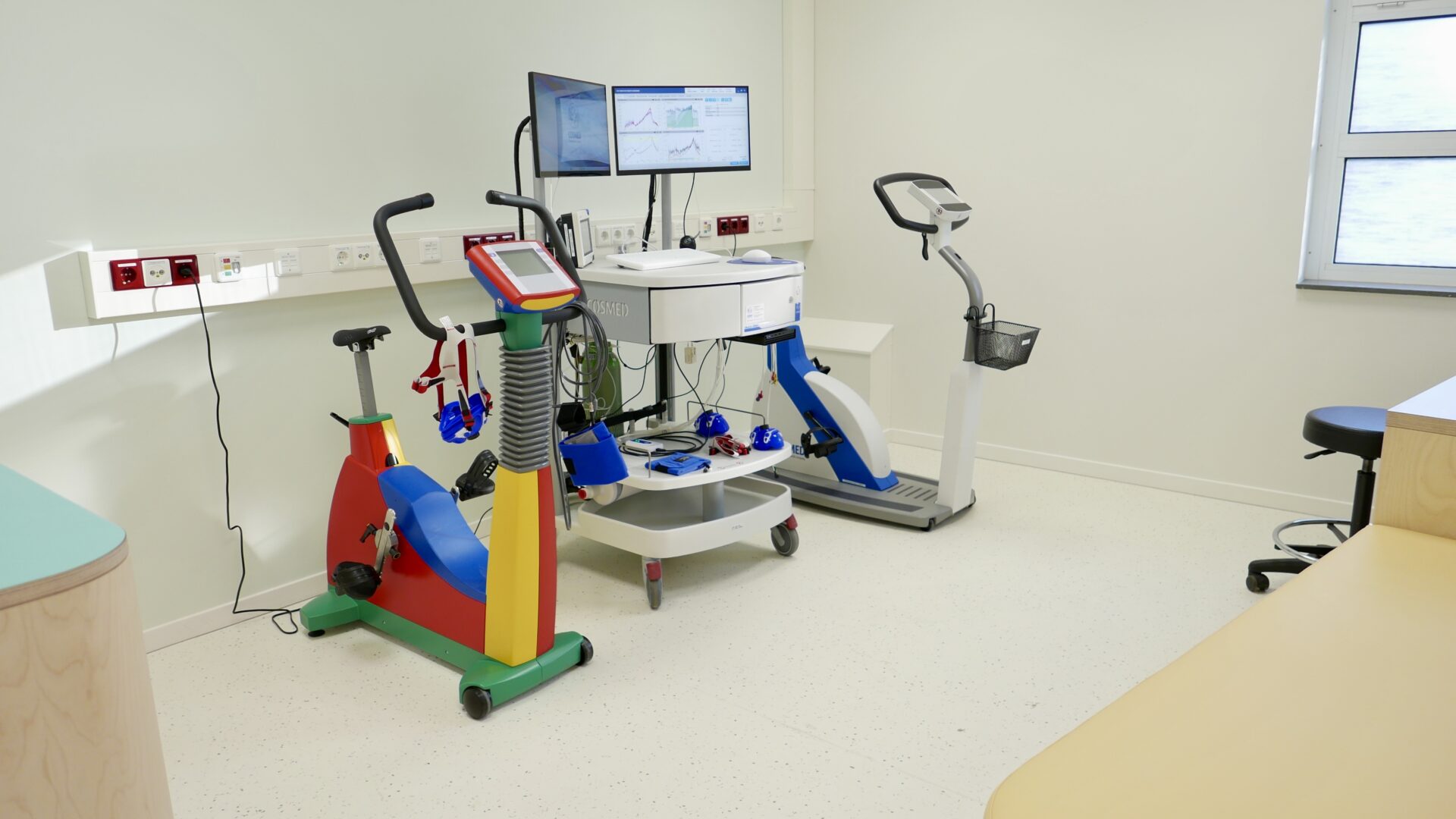 Als je het nieuwe centrum binnenloopt, heb je niet meer het gevoel dat je in het ziekenhuis bent. De ruimte heeft lichte, frisse, kleurige muren en doet meer denken aan een binnenspeeltuin. In speciale testkamers staan fietsen voor de fietstest, waarbij het hart goed in de gaten wordt gehouden. Jongere kinderen doen hun test op de loopband ernaast. ‘Maar ook de kinderen die opgenomen zijn, kunnen hier in het weekend onder begeleiding naartoe om te bewegen en te spelen’, geeft Hanekamp enthousiast aan.