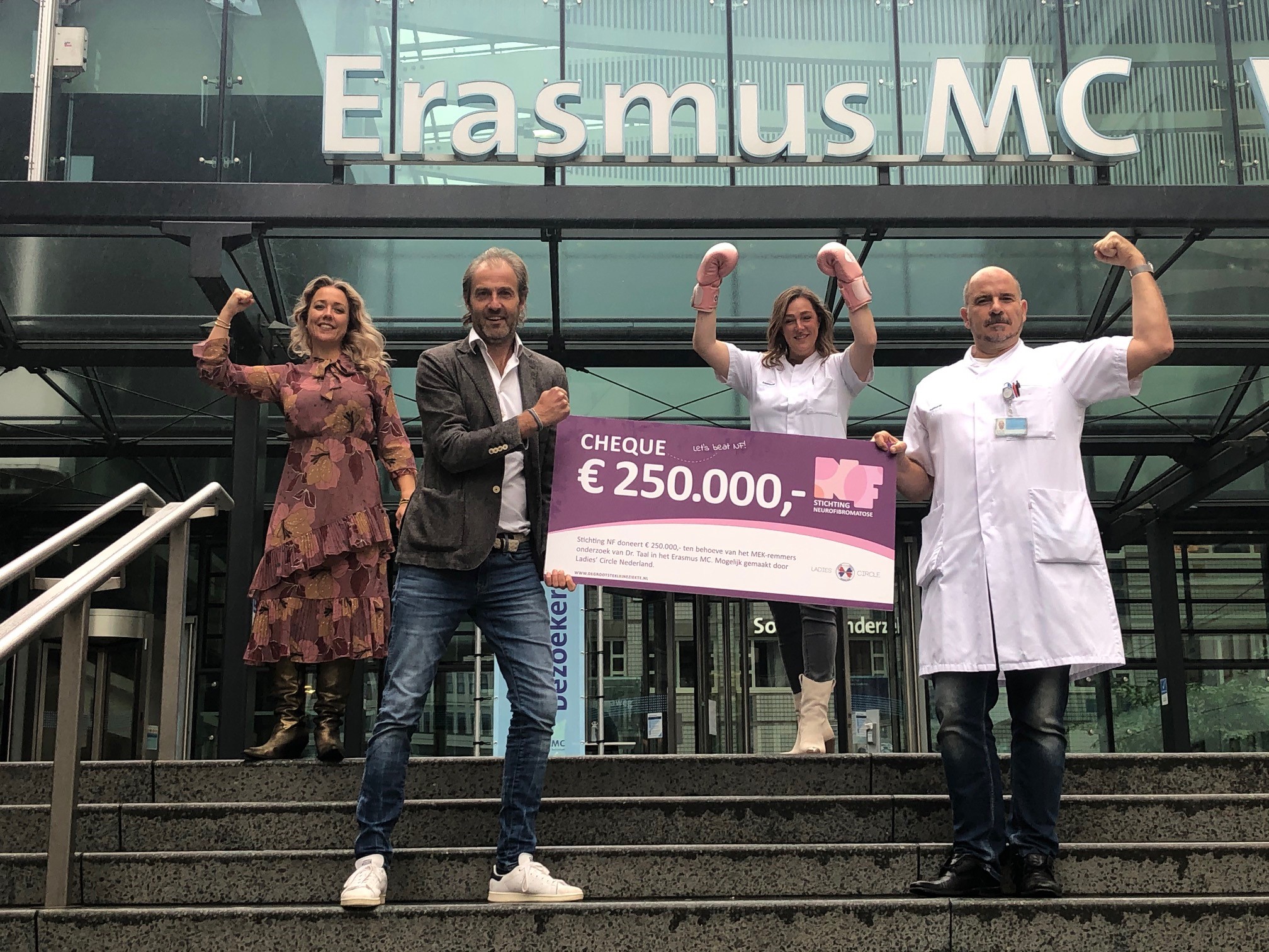 De onderzoekers kregen de cheque uit handen van bestuurslid Saskia Dekker-Tieleman en voorzitter Hubert van Wensen van Stichting Neurofibromatose. De cheque is mogelijk gemaakt door Ladies’ Circle Nederland, die zich de afgelopen twee jaar hebben ingezet voor Stichting Neurofibromatose.