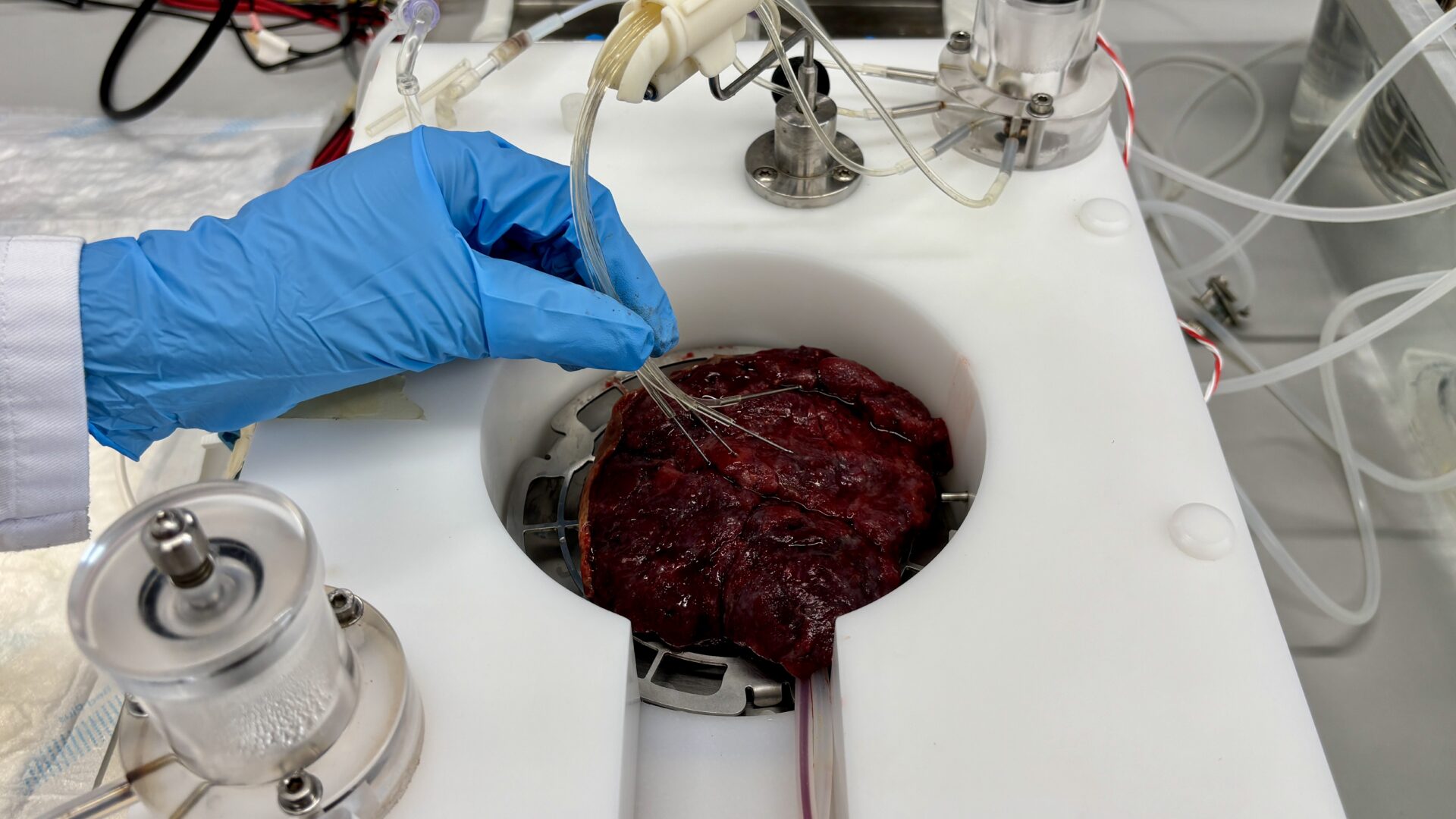 Foto: Een deel van een placenta in het perfusie-apparaat